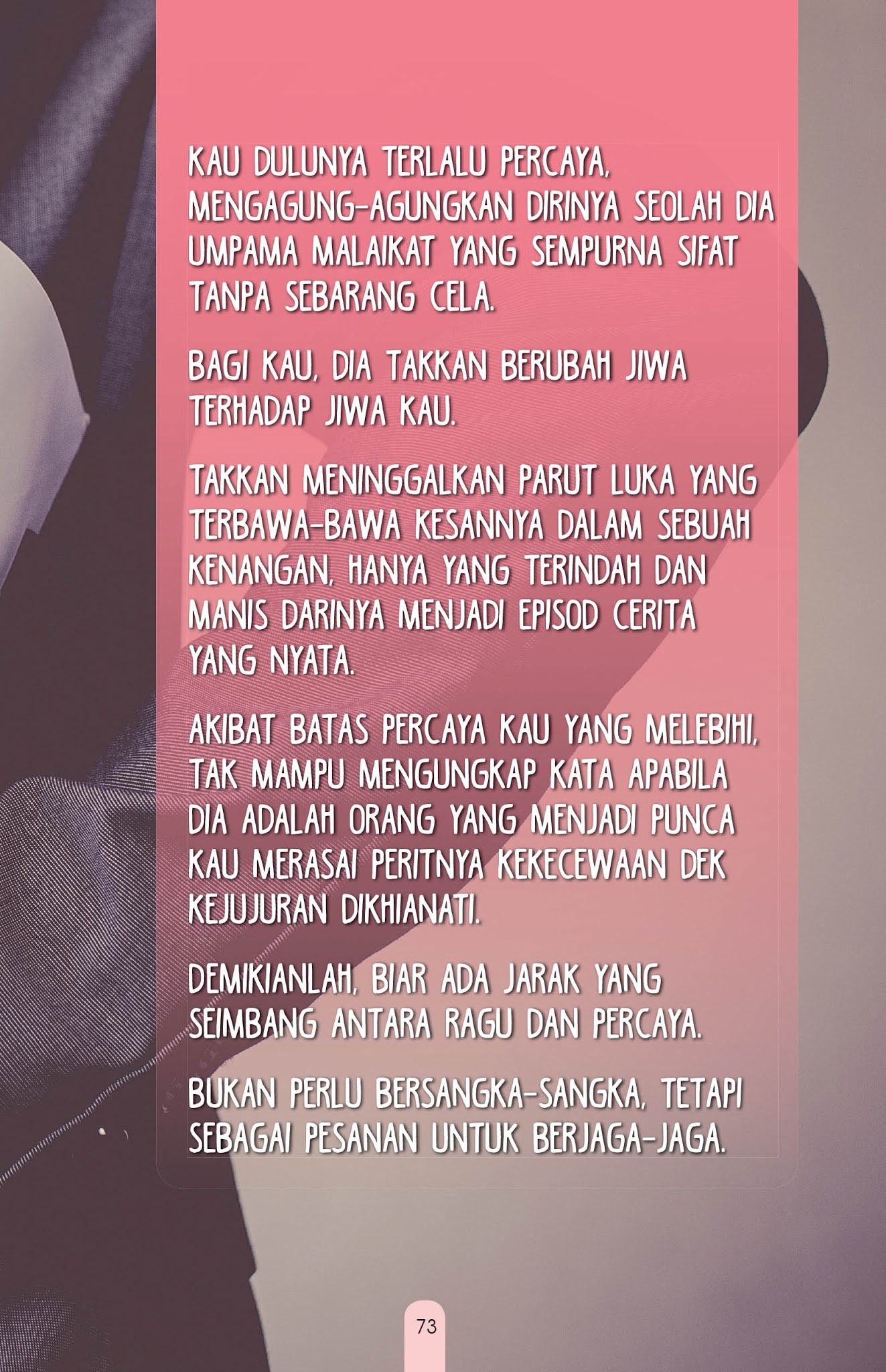 Ia adalah himpunan kata-kata yang mengekori jejak jiwa yang tercipta dalam pelbagai rasa. Kandungannya selain memenuhi titipan pesan, ayat-ayat yang tersusun membawa rentak keadaan yang tak lari daripada kehidupan manusia sejagat. Tertumpah segala punca dan alasan, jiwa diratah oleh pergelutan perasaan dengan himpitan dugaan yang noktahnya belum sampai ke titik penyelesaian.
